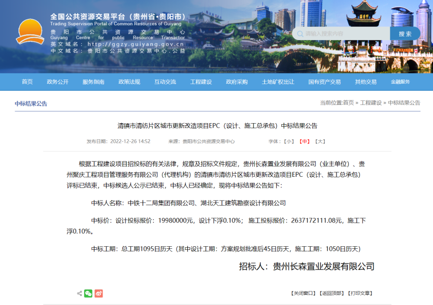 2022年12月26日,貴陽市公共資源交易中心網(wǎng)站發(fā)布清鎮(zhèn)市清紡片區(qū)城市更新改造項目EPC(設計、施工總承包)中標結果公告,湖北天工建筑勘察設計有限公司聯(lián)合中鐵十二局集團有限公司中標26億城市更新改造EPC項目,其中設計費1998萬,中標總工期1095天,設計工期為方案規(guī)劃批準后45天,施工工期1050天。