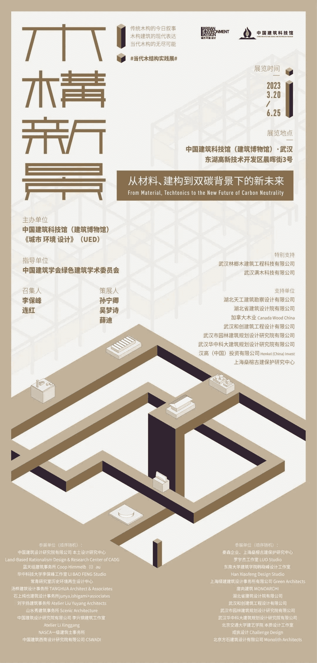 由湖北天工建筑勘察設(shè)計(jì)有限公司牽頭支持,李保峰大師召集,《城市 環(huán)境 設(shè)計(jì)》雜志和中國建筑科技館主辦的“木構(gòu)新景:當(dāng)代木結(jié)構(gòu)實(shí)踐展”將于3月20日至6月25日在武漢中國建筑科技館舉辦,主題是:從材料、建構(gòu)到雙碳背景下的新未來!