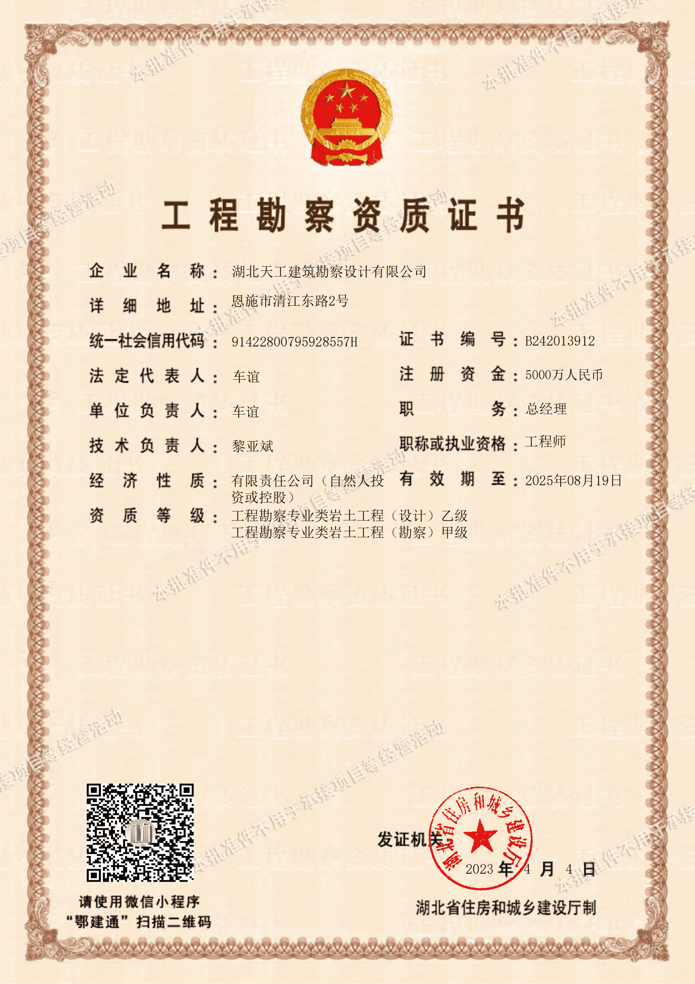 湖北天工建筑勘察設計有限公司(以下簡稱“天工院”)近日取得工程勘察巖土工程專業(巖土工程勘察(勘察))甲級資質。