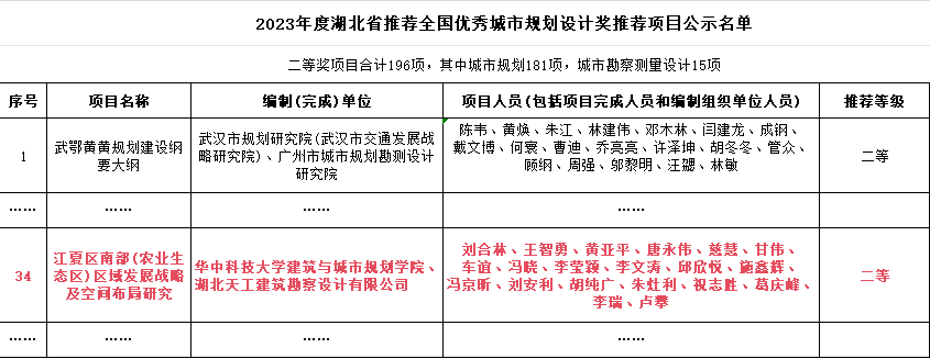 2023年11月30日,湖北省城市規(guī)劃協(xié)會公示了2023年度湖北省推薦全國優(yōu)秀城市規(guī)劃設(shè)計獎推薦項目名單,湖北天工建筑勘察設(shè)計有限公司聯(lián)合華中科技大學完成的“江夏區(qū)南部(農(nóng)業(yè)生態(tài)區(qū))區(qū)域發(fā)展戰(zhàn)略及空間布局研究”項目榮獲二等獎,并計劃申報國家級獎項?。ㄗ迦耍豪铈拢?/p>