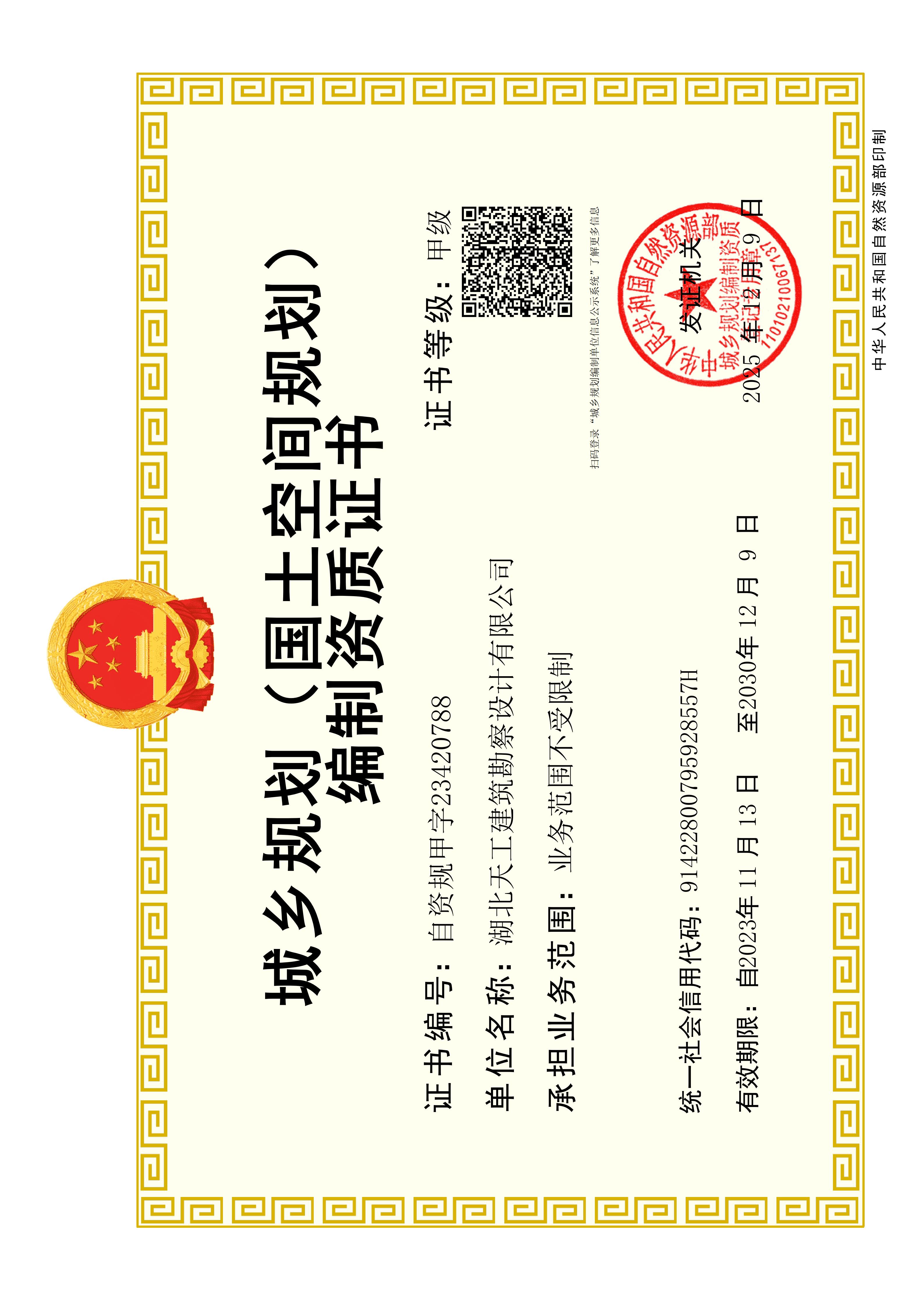 城鄉規劃甲級資質是我國城鄉規劃編制領域的最高級別資質。該資質的成功延續,標志著湖北天工在專業技術人員配置、技術裝備水平、質量管理體系以及承擔各類城鄉規劃編制業務的能力等方面,持續滿足并超越了國家最高標準。它不僅是公司參與重大、復雜城鄉規劃項目的“通行證”,更是客戶信賴、市場認可的“金字招牌”。