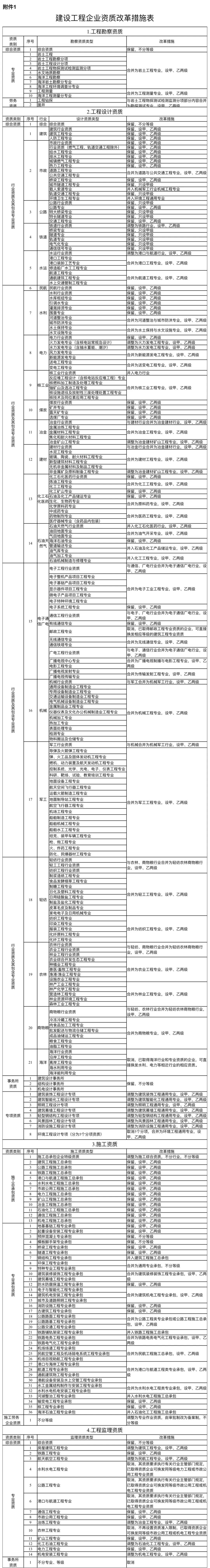 (一)精簡資質類別,歸并等級設置。為在疫情防控常態化條件下做好“六穩”工作、落實“六保”任務,進一步優化建筑市場營商環境,確保新舊資質平穩過渡,保障工程質量安全,按照穩中求進的原則,積極穩妥推進建設工程企業資質管理制度改革。對部分專業劃分過細、業務范圍相近、市場需求較小的企業資質類別予以合并,對層級過多的資質等級進行歸并。改革后,工程勘察資質分為綜合資質和專業資質,工程設計資質分為綜合資質、行業資質、專業和事務所資質,施工資質分為綜合資質、施工總承包資質、專業承包資質和專業作業資質,工程監理資質分為綜合資質和專業資質。資質等級原則上壓減為甲、乙兩級(部分資質只設甲級或不分等級),資質等級壓減后,中小企業承攬業務范圍將進一步放寬,有利于促進中小企業發展。具體壓減情況如下: