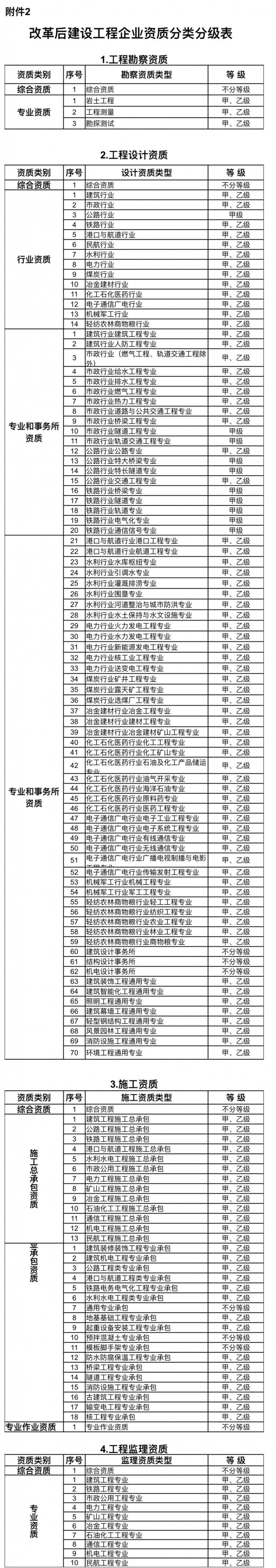 2.工程設計資質。保留綜合資質;將21類行業資質整合為14類行業資質;將151類專業資質、8類專項資質、3類事務所資質整合為70類專業和事務所資質。綜合資質、事務所資質不分等級;行業資質、專業資質等級原則上壓減為甲、乙兩級(部分資質只設甲級)。